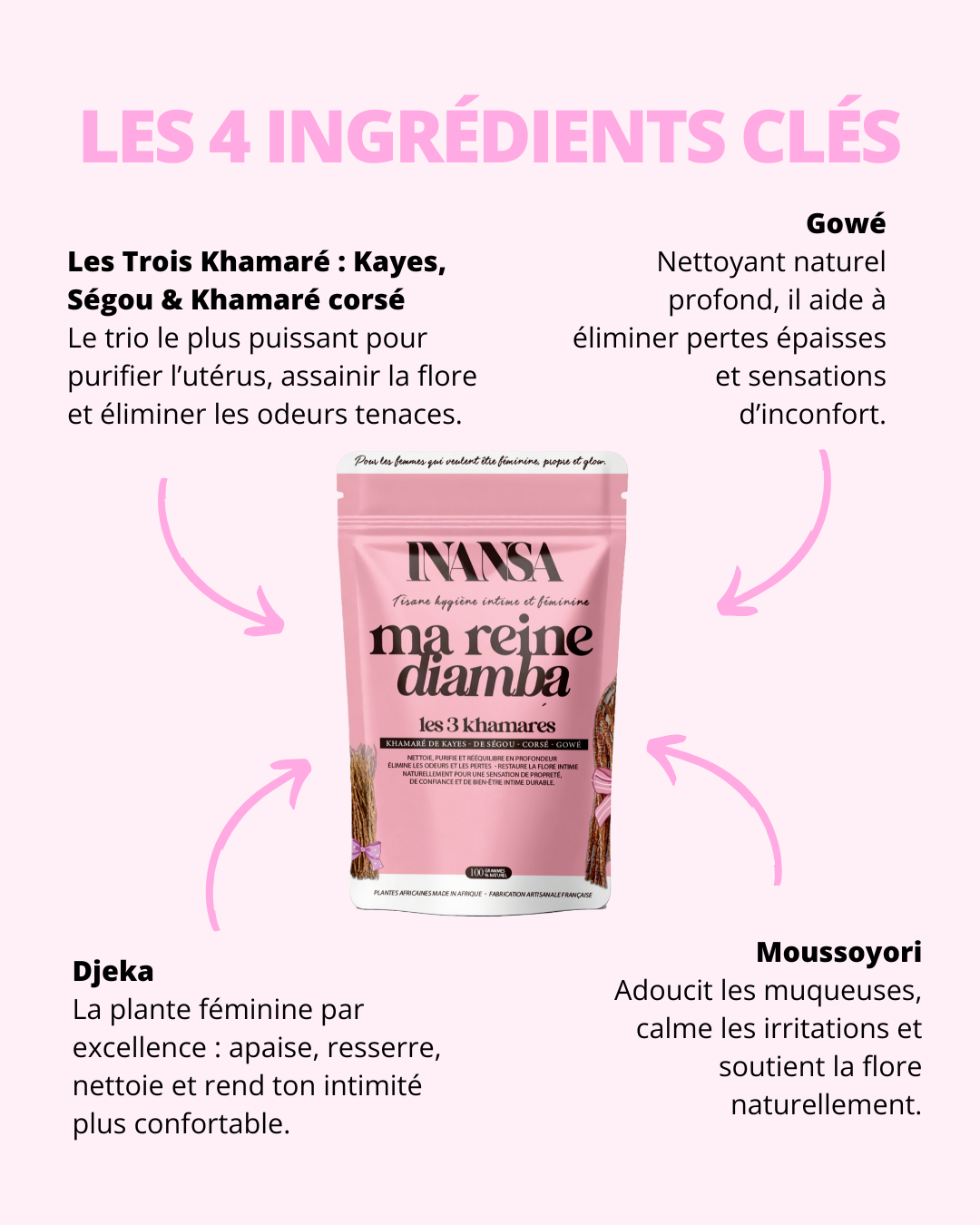 Les Trois Khamaré (Ségou, Kayes & Corsé) : nettoient ton utérus et ton intimité en profondeur, éliminent les impuretés, réduisent les pertes odorantes et purifient naturellement la flore vaginale.