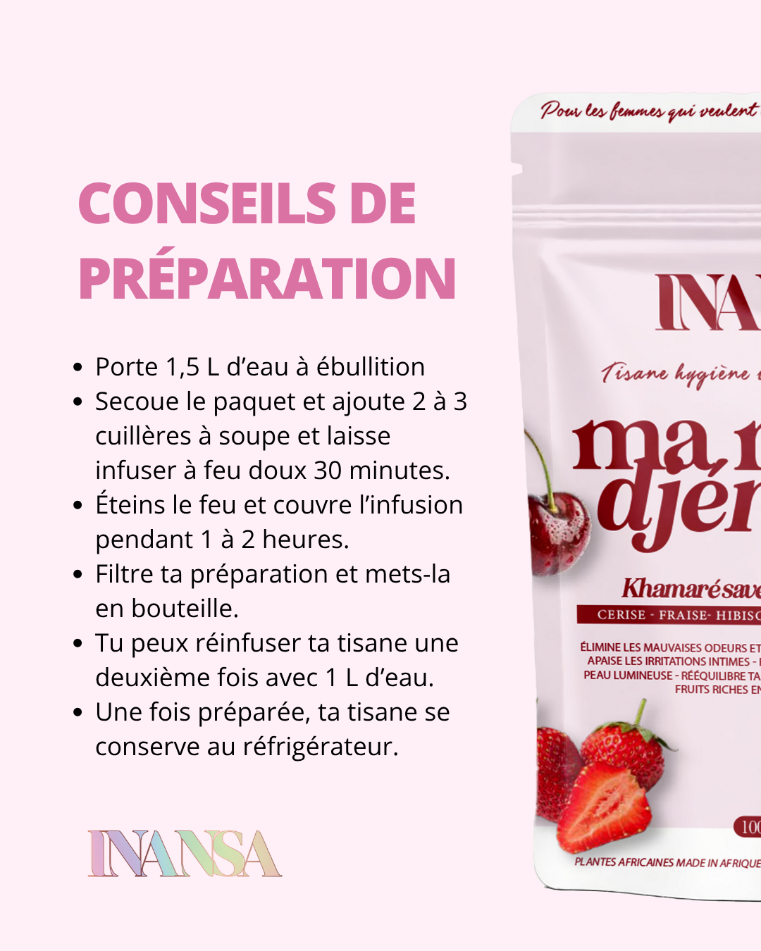 Dès que les règles reviennent, commence directement par Djénéba : c’est la tisane qui neutralise le plus les odeurs et les pertes odorantes pendant le flux.